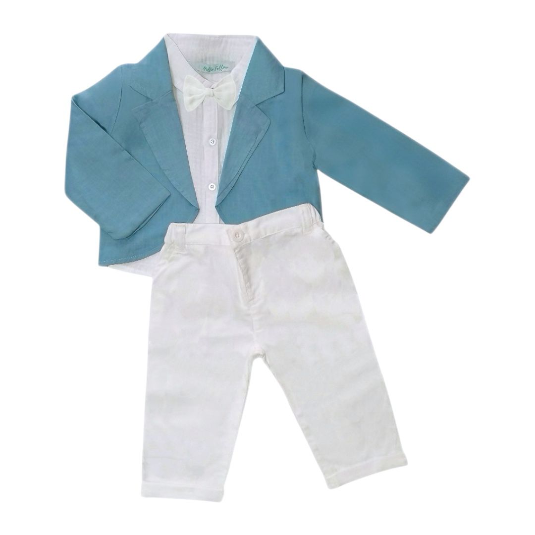 This boy’s formal outfit blends classic elegance with modern style, featuring a crisp white muslin shirt paired with matching white pants for a clean, polished look. The striking blue full coat adds a refined contrast, while the white bow completes the ensemble with a touch of sophistication. Perfect for special occasions, this coordinated set ensures comfort and style for young gentlemen.