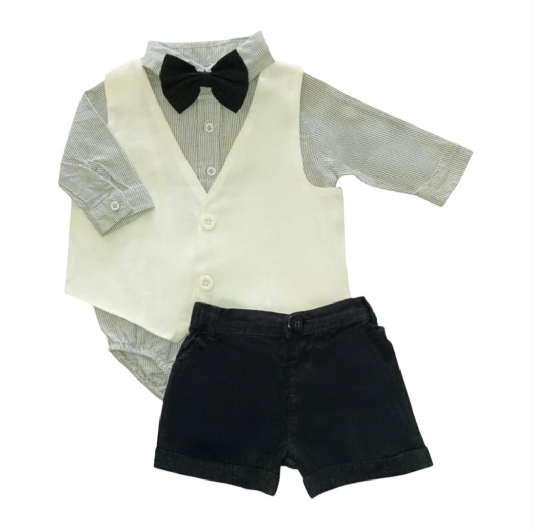 Expertly crafted for young boys, this black and white striped dungaree shirt comes complete with a matching waist coat, comfortable shorts, and a stylish bow. The perfect outfit for any formal event, this set is sure to make a lasting impression.