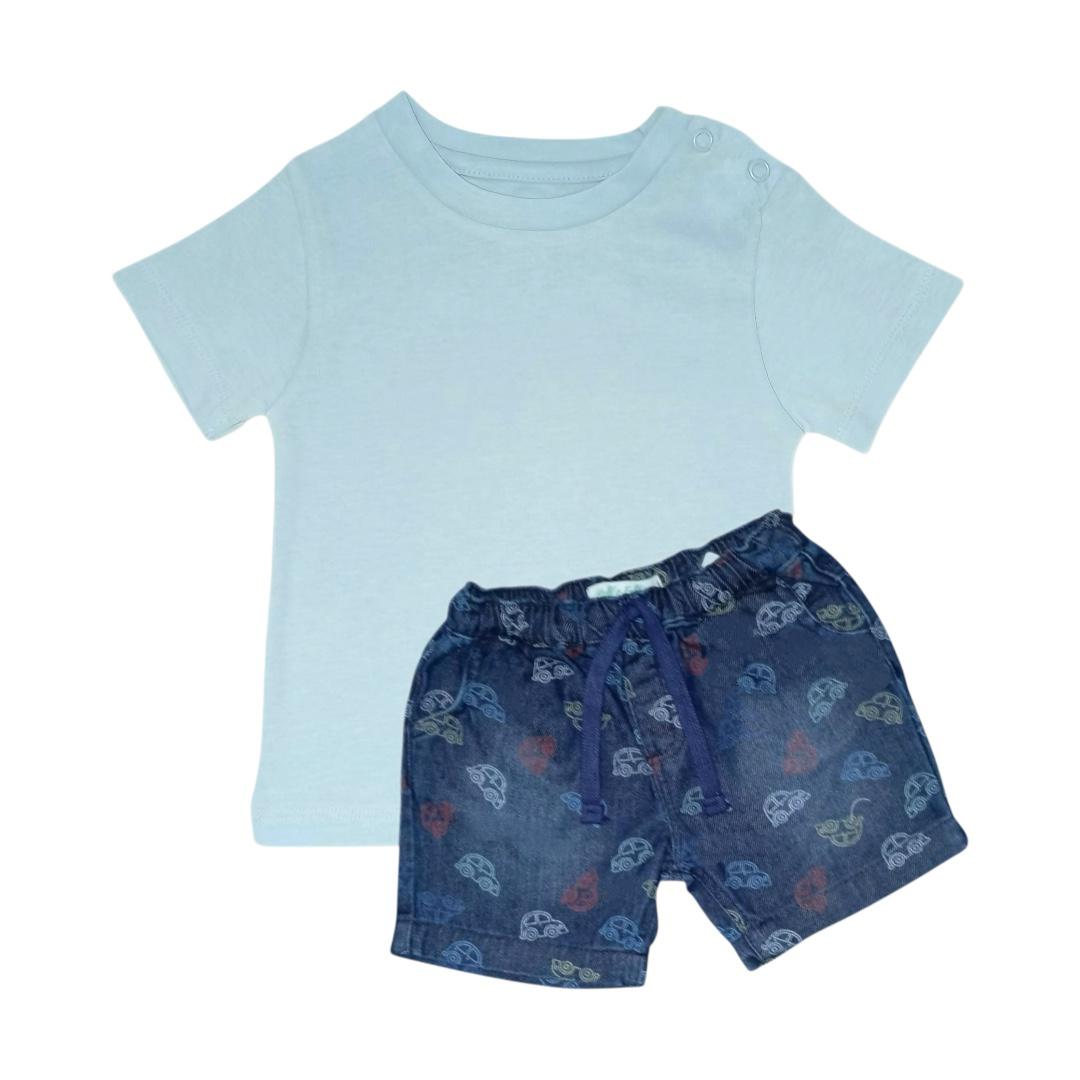 This kids' outfit features a light blue t-shirt paired with denim shorts adorned with playful car prints. Designed for comfort and durability, it suits both boys and girls, making it a versatile choice for everyday wear. The breathable fabric ensures ease of movement, perfect for active children.