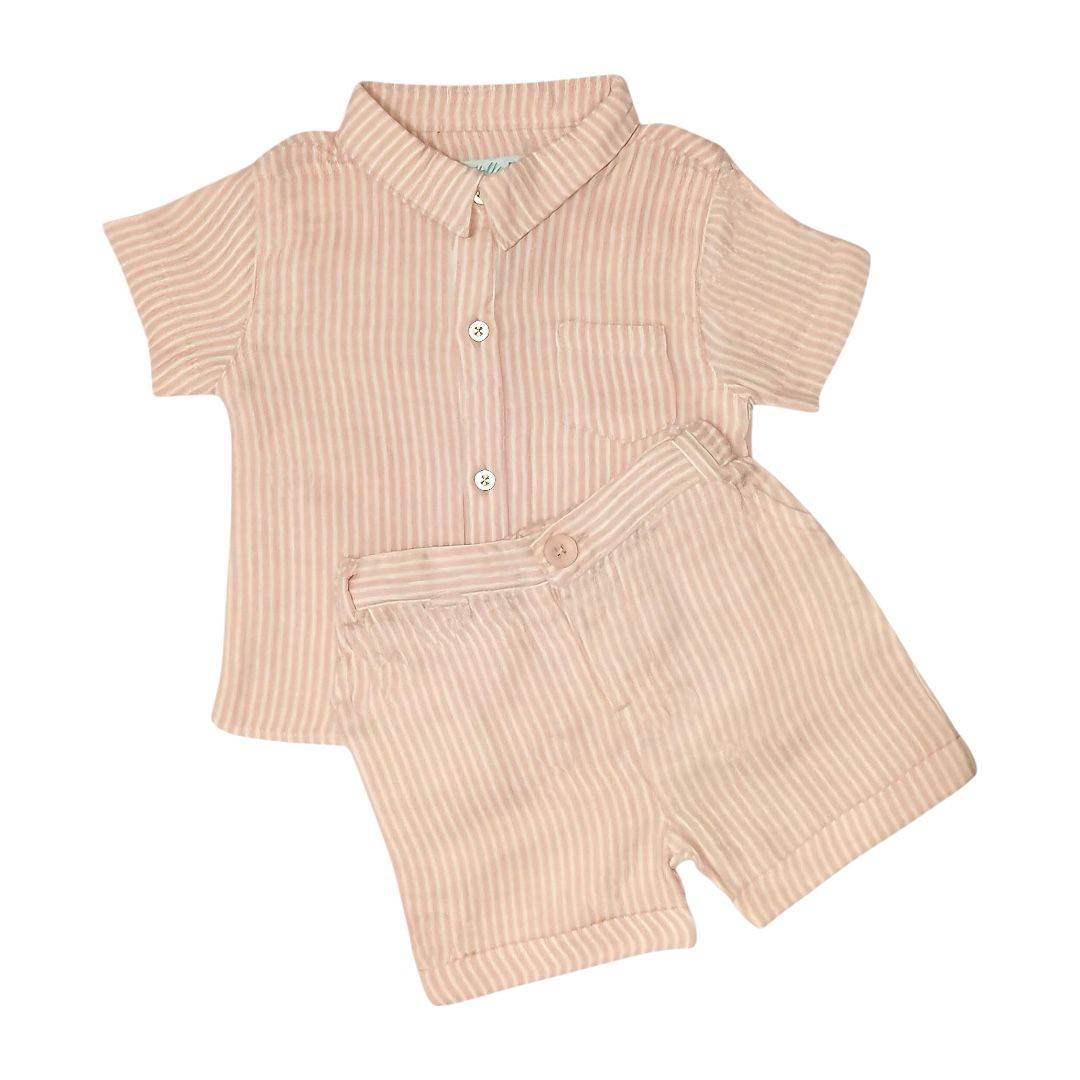 This kids' shirt and short set in peach and white stripes is crafted from soft muslin material, offering exceptional breathability and gentle comfort for sensitive skin. The lightweight, airy fabric keeps children cool and comfortable during play or rest. Designed with a stylish striped pattern, this set balances practicality and aesthetic, making it an ideal choice for warm weather and everyday wear. Durable and easy to maintain, it supports active lifestyles while ensuring a charming look.